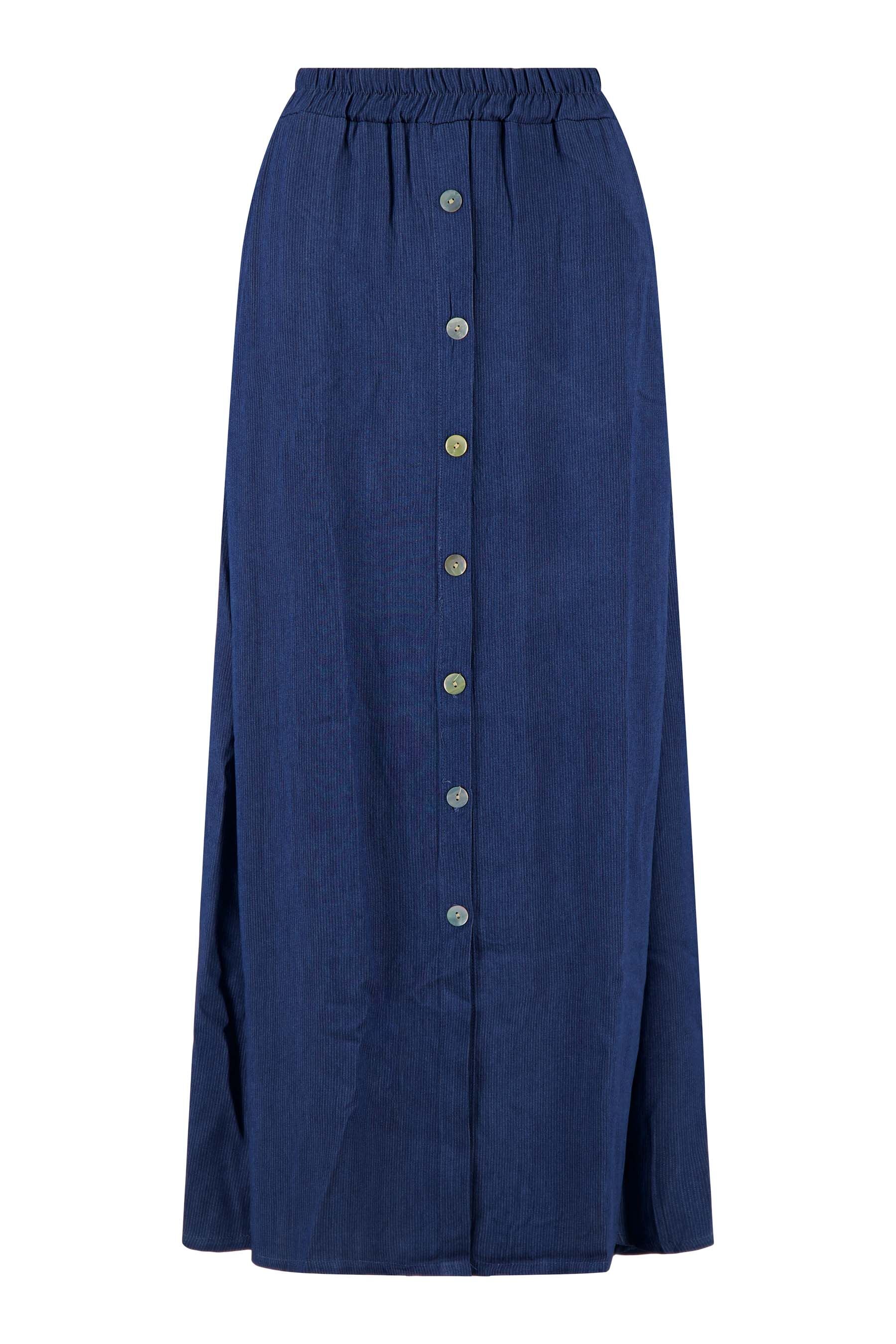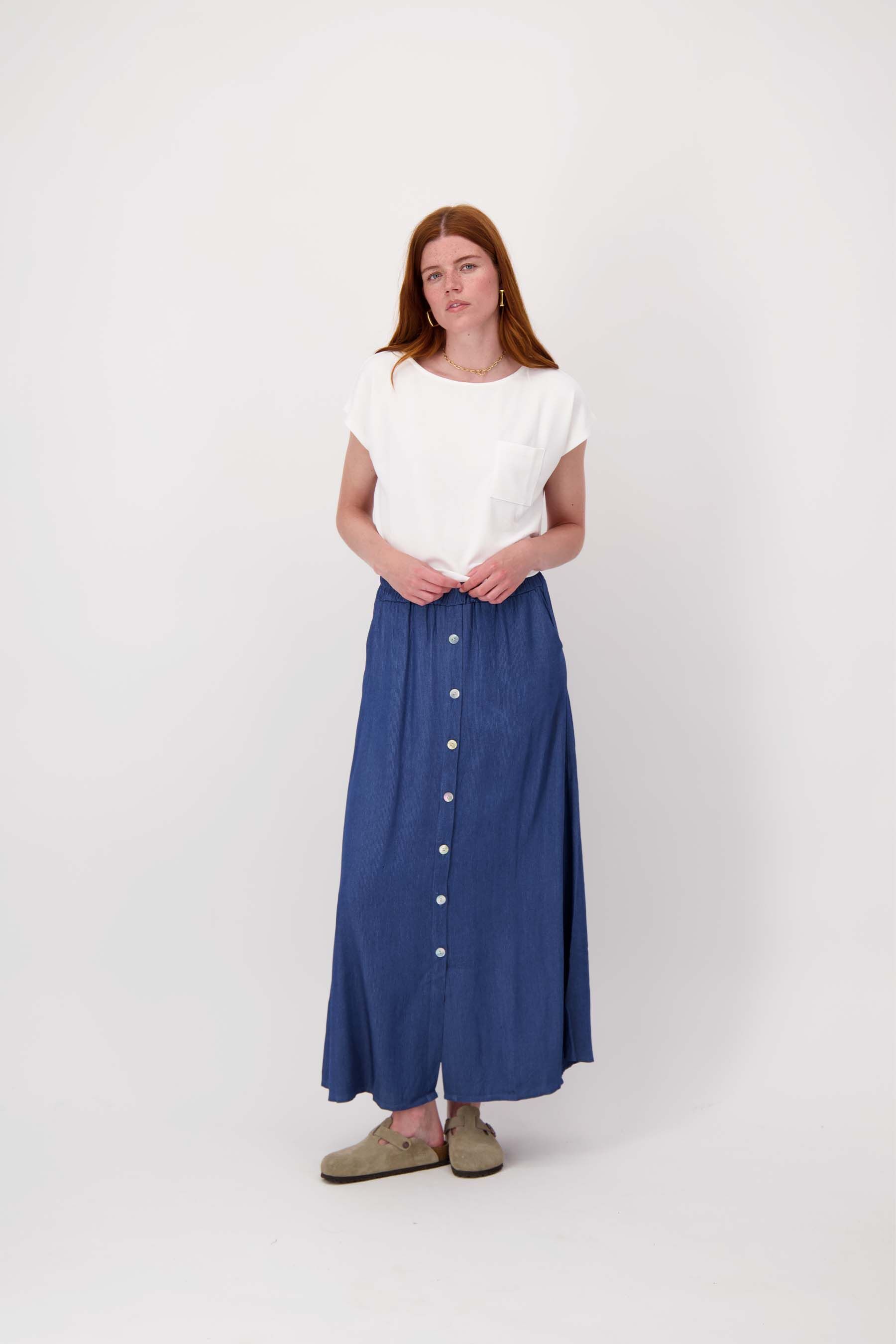 De Zusss denim rok is een comfortabele en stijlvolle musthave voor jouw garderobe. Deze mid blue denim rok combineert moeiteloos casual met chic dankzij de zachte tencel stof. De rok is voorzien van subtiele strepen en een rij knopen aan de voorkant, wat zorgt voor een speels accent. Het elastische taillebandje maakt deze denim rok extra draagbaar en perfect voor iedere dag. Dankzij het lichte en soepelvallende materiaal is deze rok jouw favoriete item voor het hele seizoen.Materiaal: 100% viscoseKleur: blauwArtikelnummer: 0302-0011Model draagt maat S en is 180cm lang