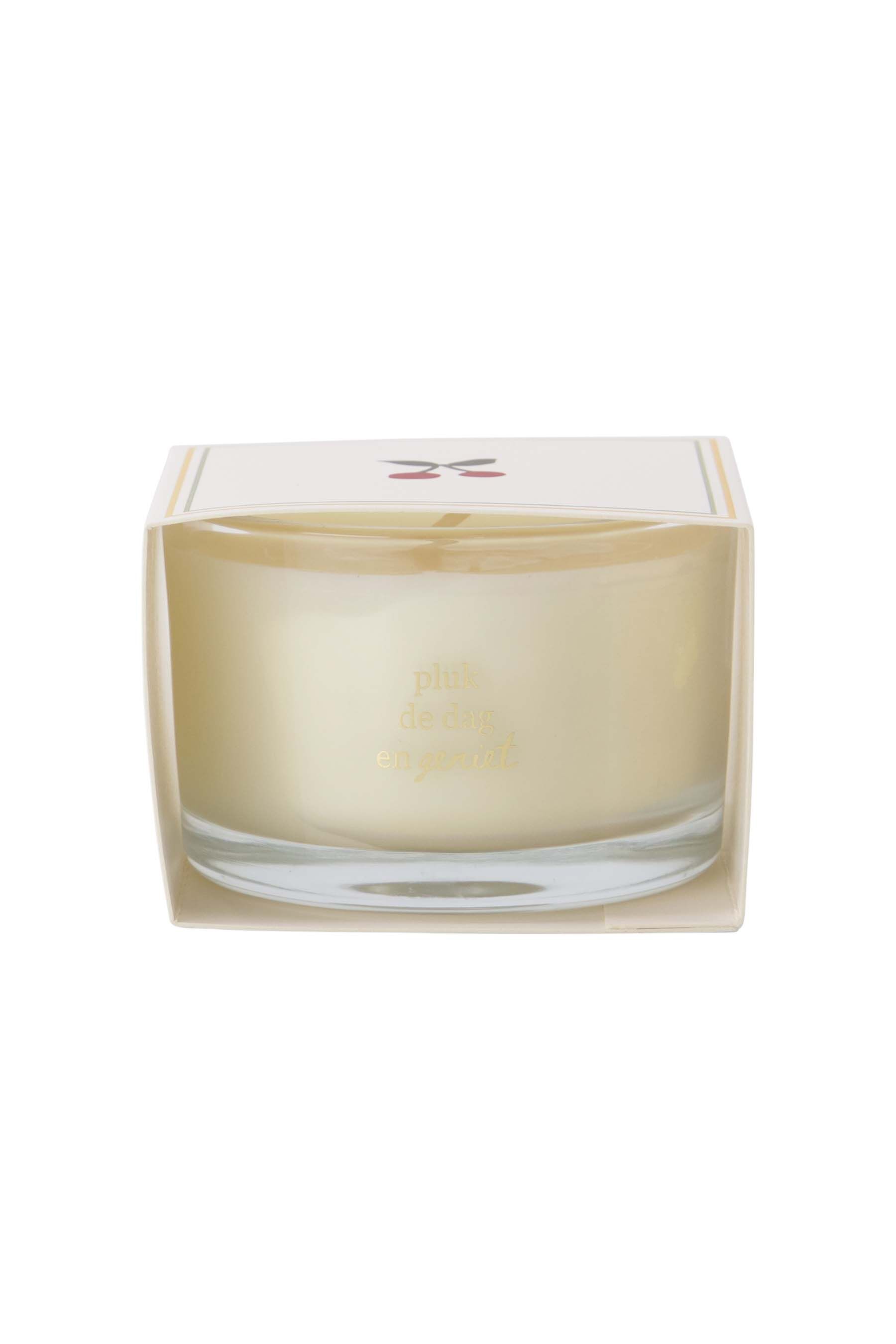 Deze Zusss geurkaars met wikkel brengt sfeer en warmte in huis. De geurkaars in wikkel pluk de dag en geniet is wit van kleur en gemaakt van hoogwaardige materialen, ideaal voor een gezellige ambiance. Met een compacte maat past deze geurkaars overal, perfect om elke dag te plukken en te genieten. De stijlvolle, minimalistische wikkel met een subtiel kersenmotief geeft een vrolijke touch aan je interieur