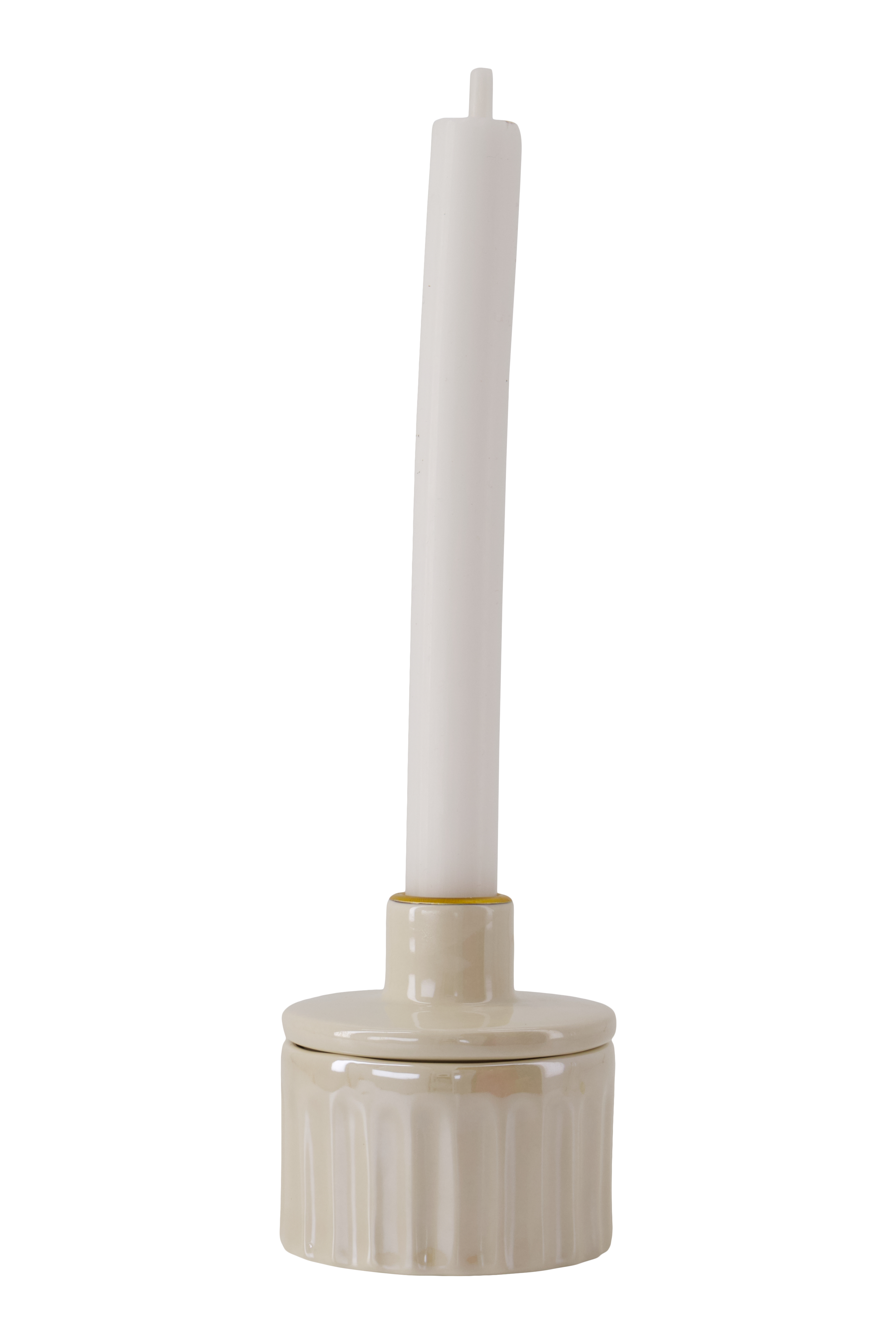 De Zusss kandelaar keramiek parelmoer ribbel met deksel is een stijlvolle eyecatcher voor elk interieur. Deze kandelaar is gemaakt van hoogwaardig keramiek met een parelmoer afwerking, uitgevoerd in een zachte zandkleur. Het ribbelige design gecombineerd met een subtiel gouden randje geeft een unieke en elegante uitstraling. Met een compacte maat past deze kandelaar perfect op tafels en dressoirs.