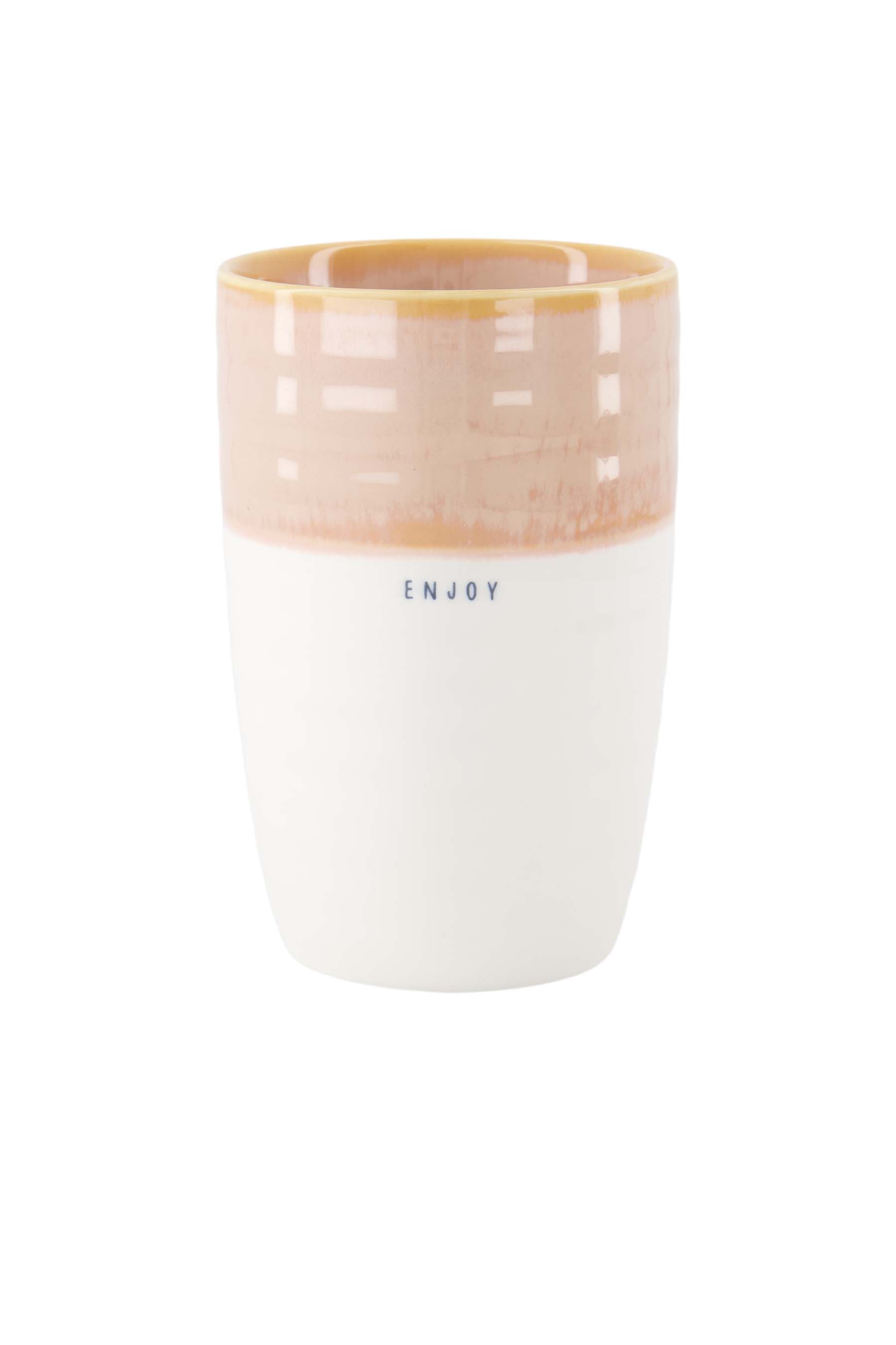 De Zusss mok L enjoy is een prachtige toevoeging aan je serviescollectie. Deze mok enjoy is vervaardigd van hoogwaardig keramiek en combineert een zachte witte onderkant met een lichtroze bovenrand. Met een hoogte van ongeveer 10 cm is deze mok perfect voor je favoriete warme dranken. De subtiele tekst enjoy maakt het geheel extra lief en persoonlijk.