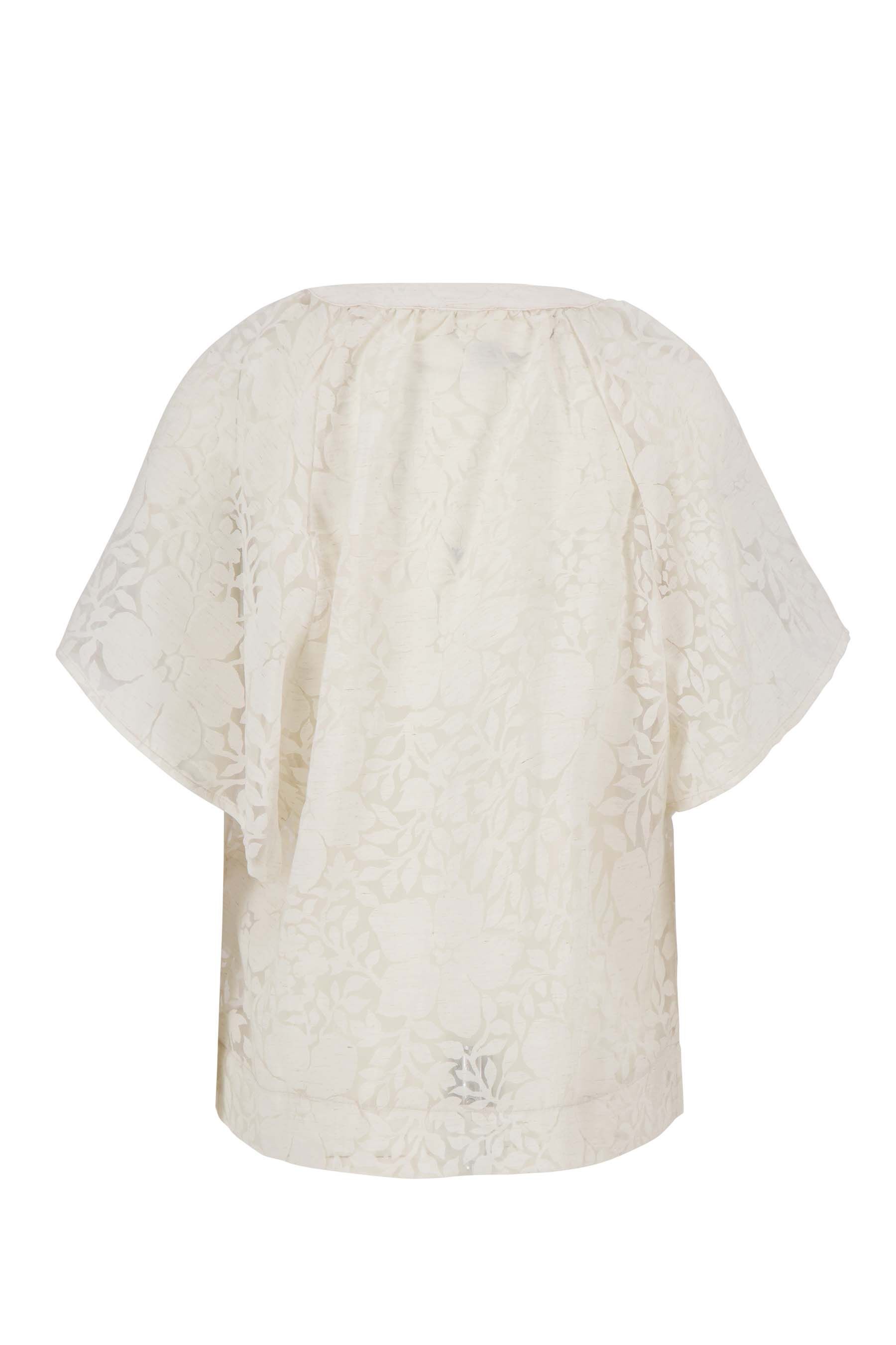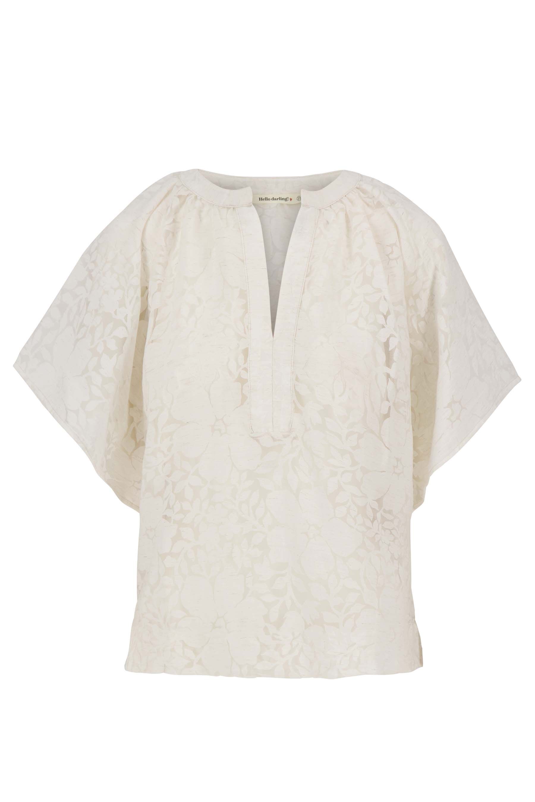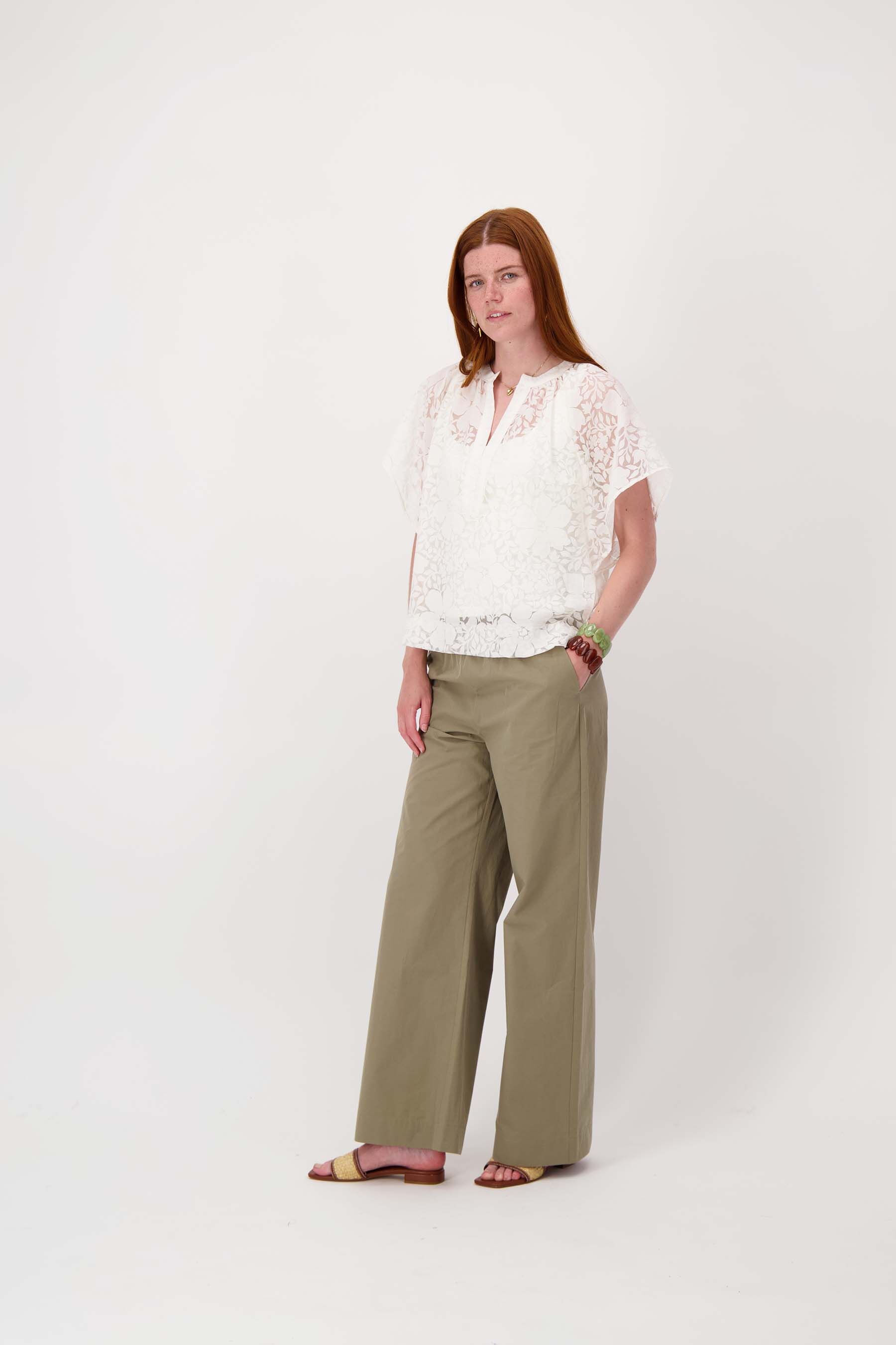 De Zusss organza blouse brengt elegantie in je garderobe met haar licht doorschijnende, off white stof en verfijnde bloemenprint. Deze organza blouse heeft een losse pasvorm en een subtiele V-hals met een kleine opstaande kraag, wat zorgt voor een vrouwelijke en stijlvolle uitstraling. De korte mouwen en het delicate materiaal maken deze blouse perfect voor zowel casual als chique combinaties. Materiaal: 4% ecovero viscose 96% polyamideKleur: witArtikelnummer: 0309-0038Model draagt maat S en is 180cm lang