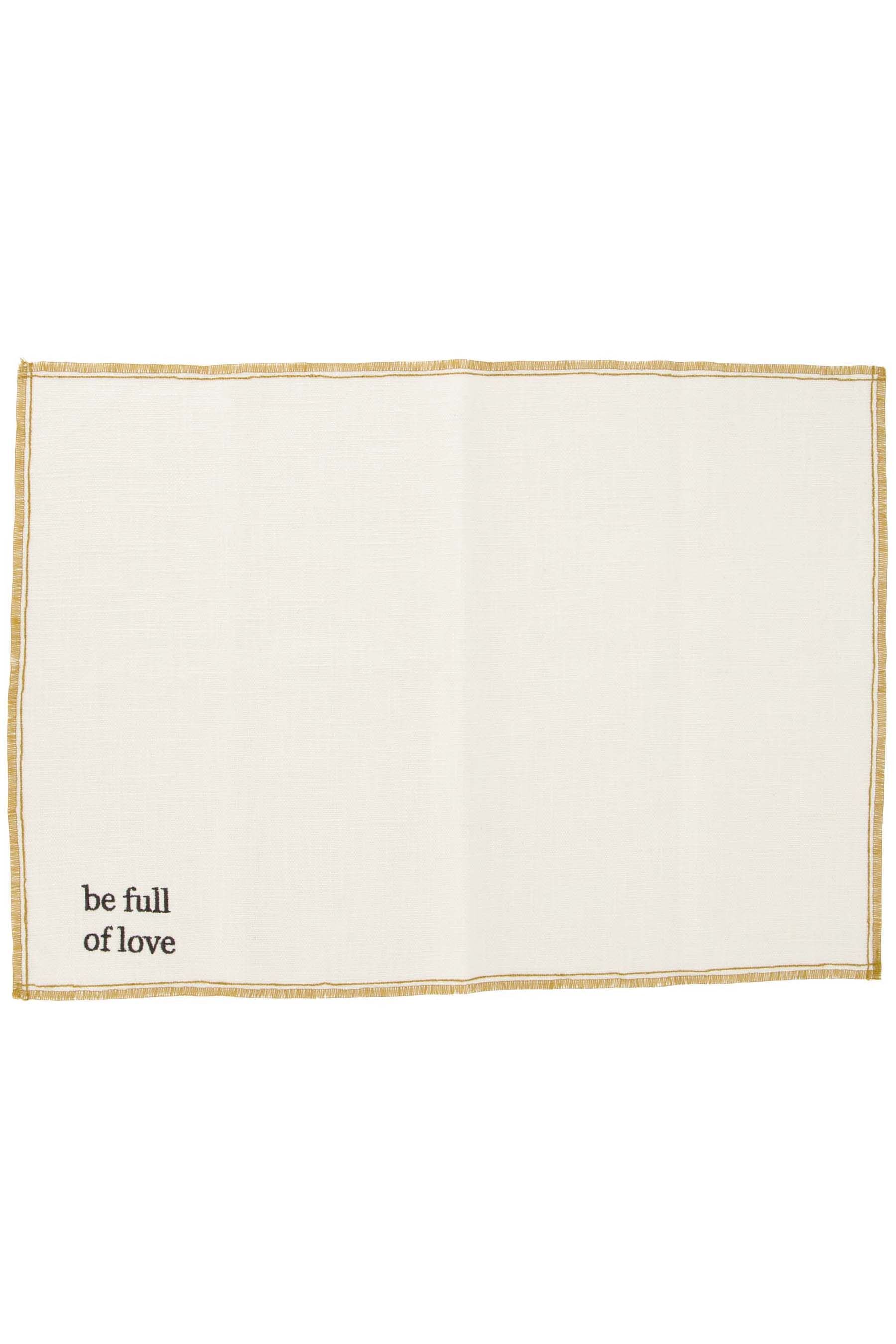 Deze Zusss placemats set is perfect voor wie houdt van een stijlvolle tafeldecoratie in wit en oker. De placemats zijn gemaakt van duurzaam materiaal en meten 30 x 50 cm, ideaal voor elke tafel. Het fijne linnenweefsel geeft een natuurlijke uitstraling en de liefdevolle tekst ‘be full of love’ maakt elke maaltijd bijzonder. Met deze placemats van Zusss breng je sfeer en gezelligheid aan tafel. Combineer ze met andere accessoires uit onze tafeldecoratie collectie voor een complete look vol warmte.