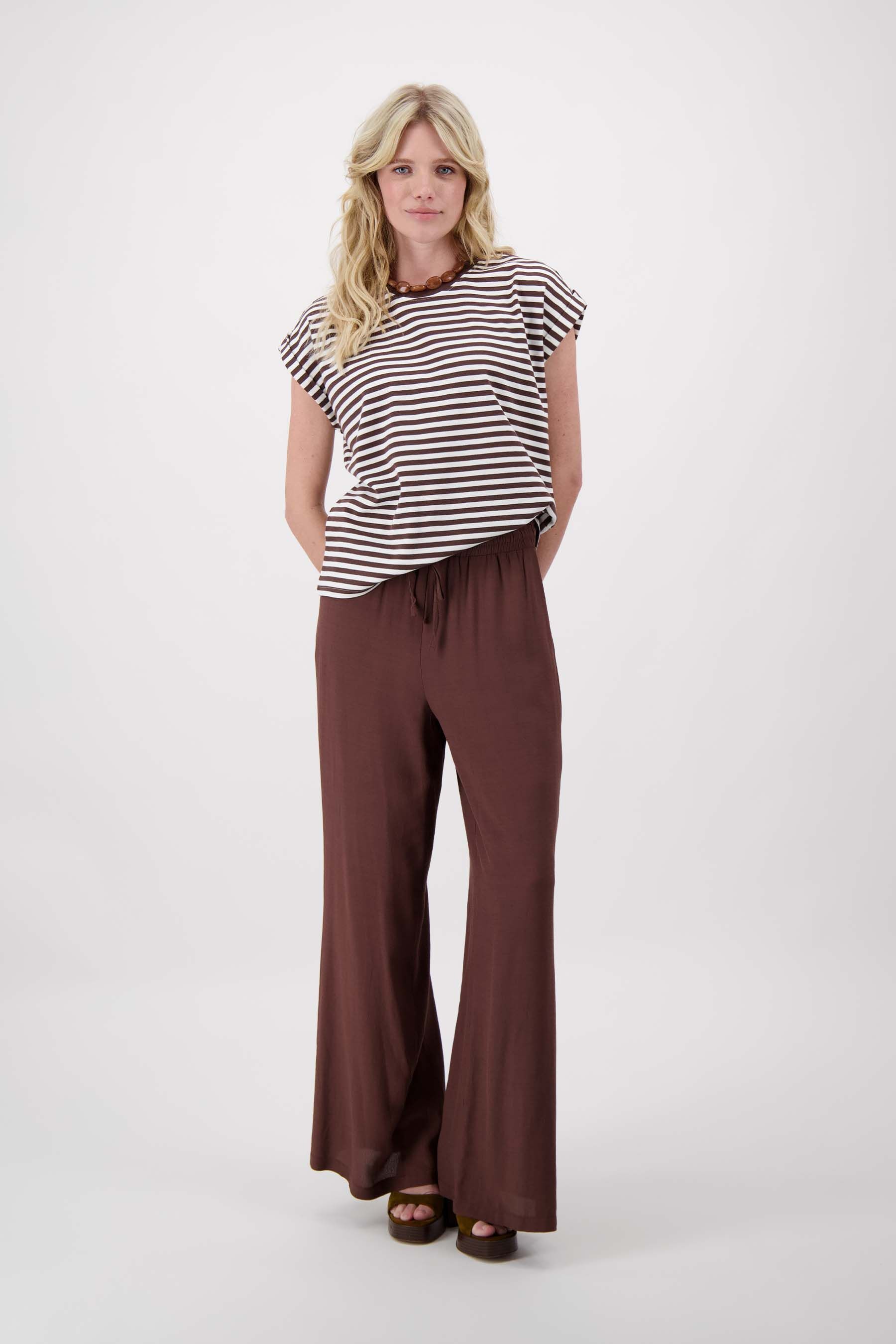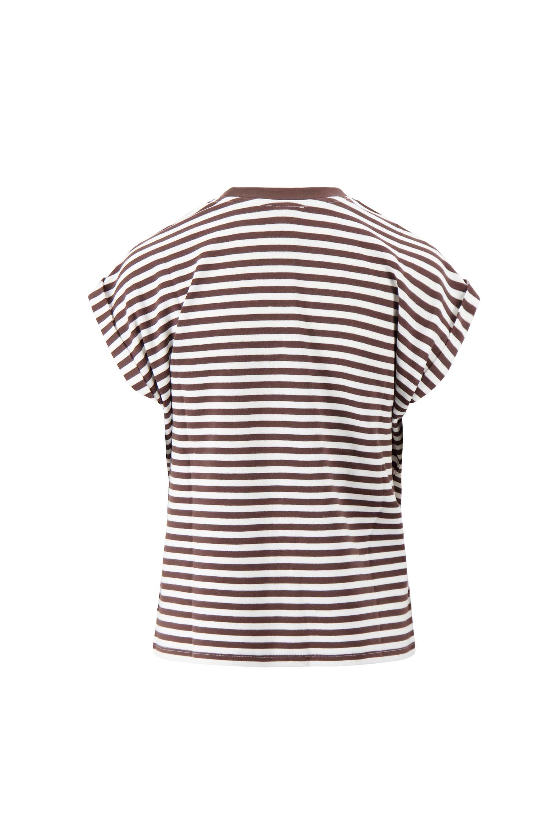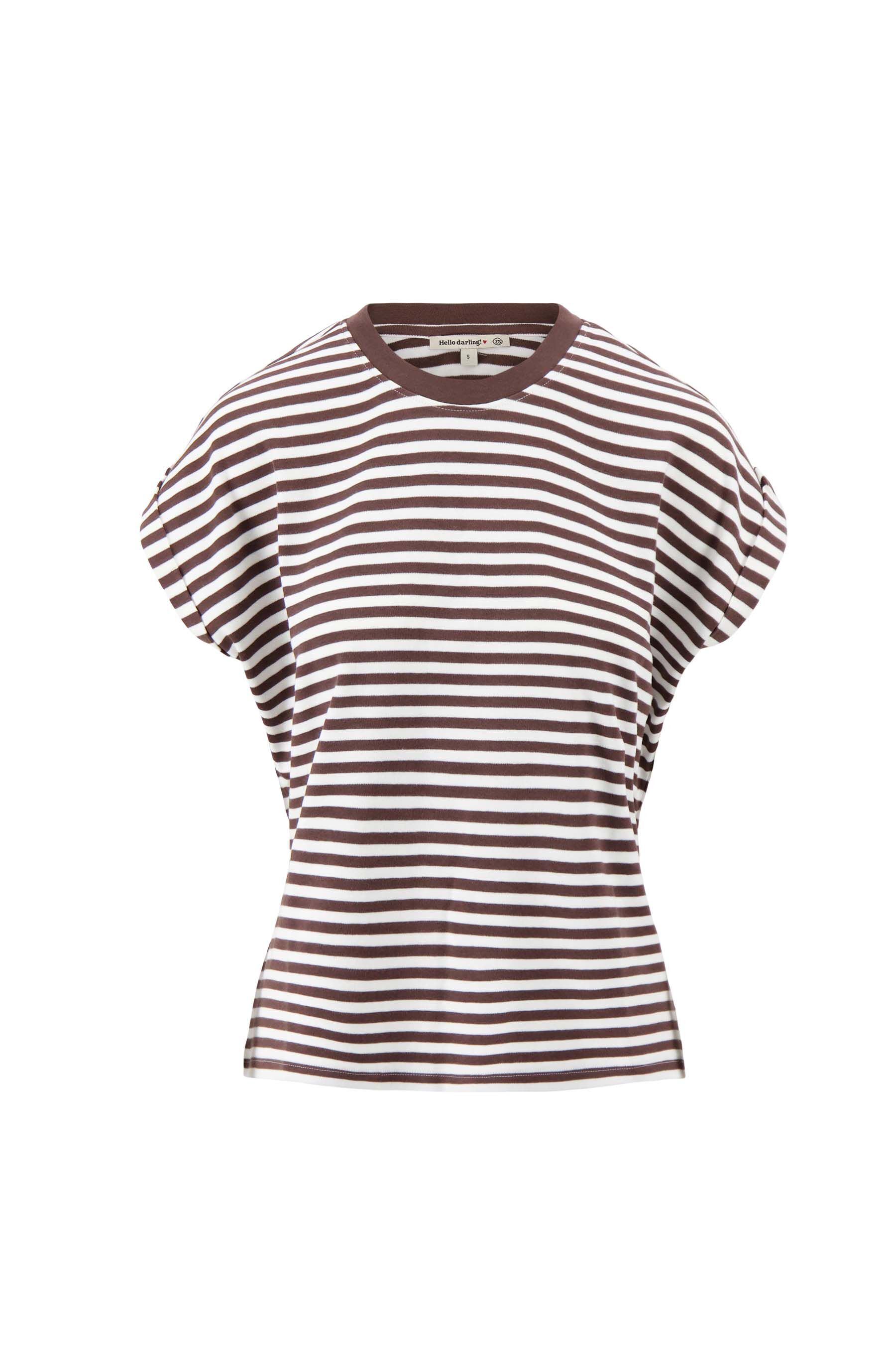 Het Zusss strepen t-shirt met opgerolde mouw geeft een ontspannen en stijlvolle uitstraling. Dit t-shirt met strepen past gemakkelijk bij verschillende outfits en is ideaal voor wie houdt van een casual en frisse look. Het t-shirt is uitgevoerd in off white met bruin gestreept dessin, wat het een tijdloze uitstraling geeft. Dankzij de opgerolde mouwen oogt het speels en net even anders dan een standaard basic.