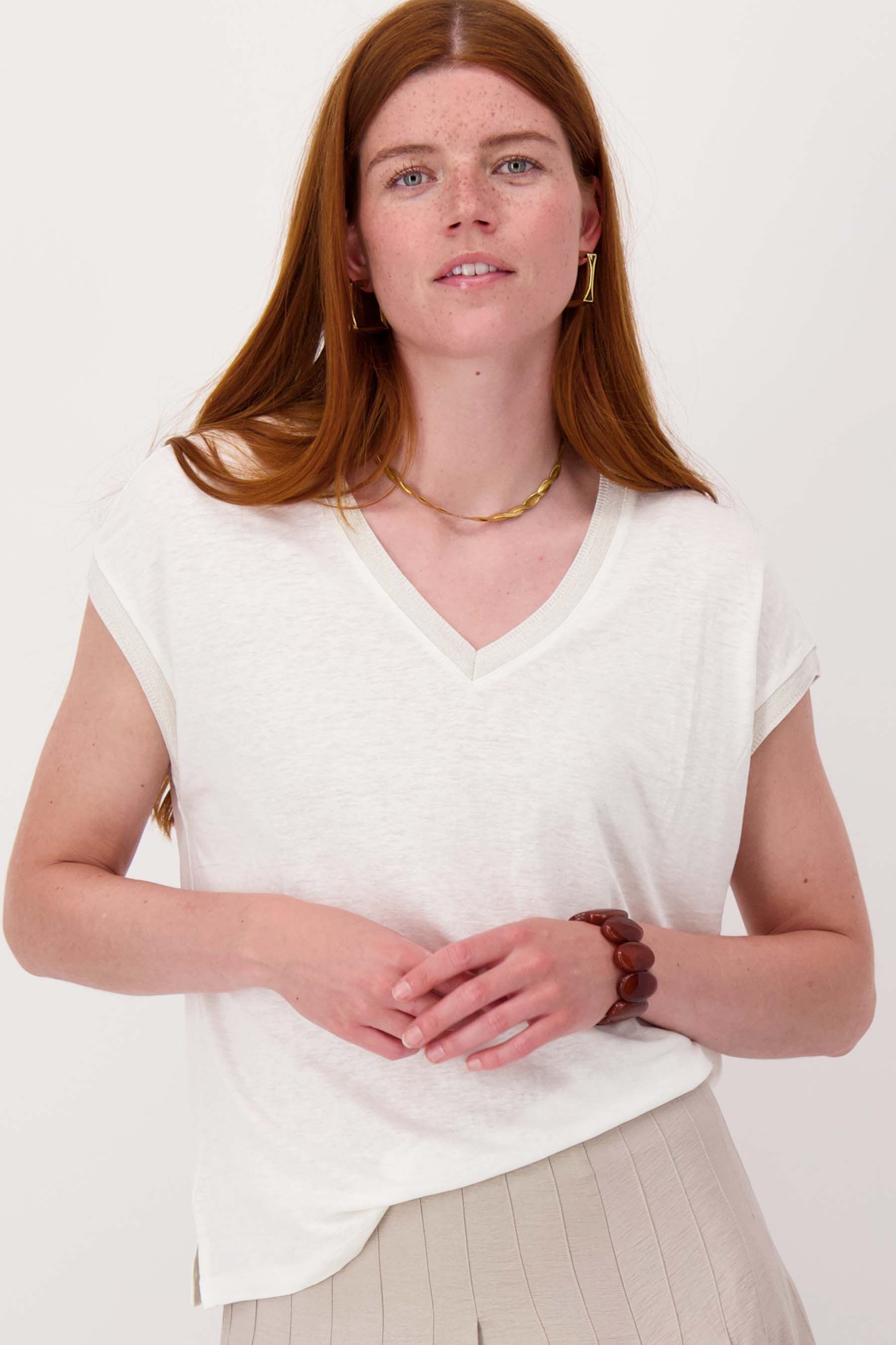 De Zusss v hals top met lurex boord is een stijlvolle musthave voor elke garderobe. Deze off white top valt op door de subtiele lurex boord die een sprankelend accent geeft. De v hals zorgt voor een vrouwelijk silhouet en het lichte materiaal maakt deze top ideaal voor elke gelegenheid. De Zusss v hals top met lurex boord geeft jouw outfit nét dat beetje extra glamour en comfort.Materiaal: 50% viscose / 50% linnenKleur: witArtikelnummer: 0304-0053Model draagt maat S en is 180cm lang