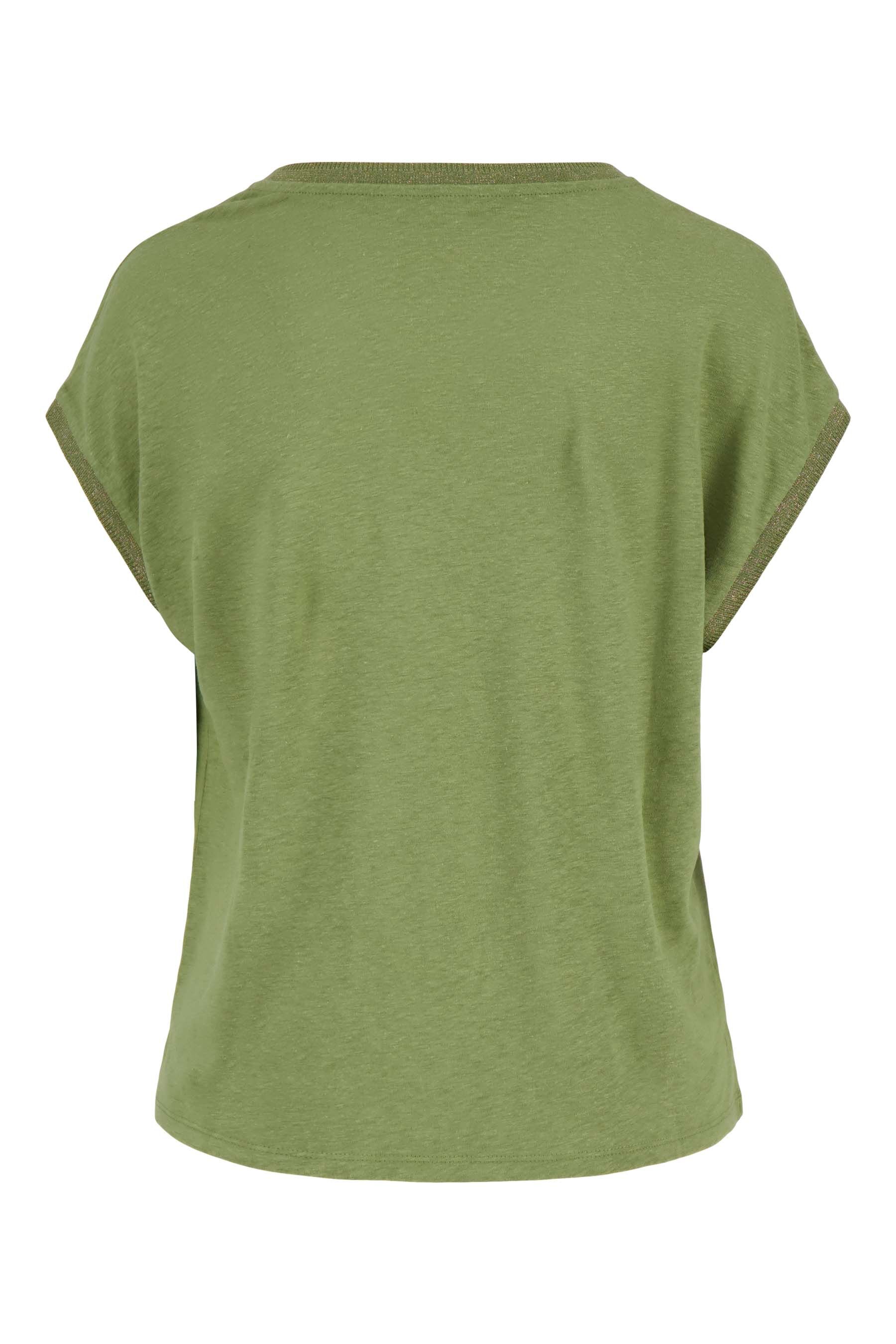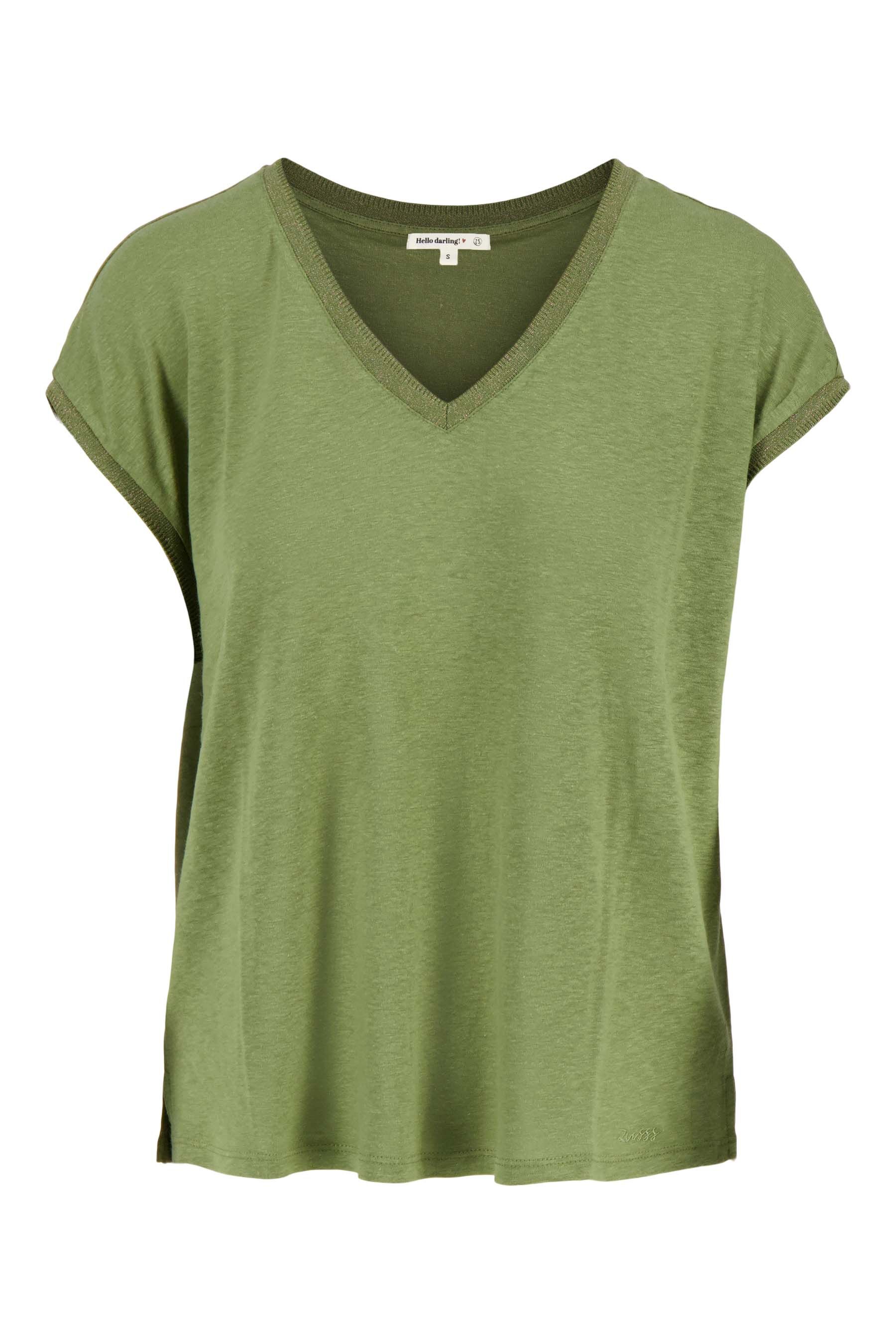 De Zusss V hals top met lurex boord is perfect voor een speelse en stijlvolle outfit. Deze top valt op door de subtiele lurex boord bij de V-hals en korte mouwen, wat een chique touch geeft. De kleur light mossgreen zorgt voor een natuurlijke, zachte uitstraling die eenvoudig te combineren is. Deze V hals top met lurex boord is een fijne toevoeging aan je garderobe en heerlijk draagbaar. Materiaal: 50% viscose / 50% linnenKleur: groenArtikelnummer: 0304-0053Model draagt maat S en is 180cm lang