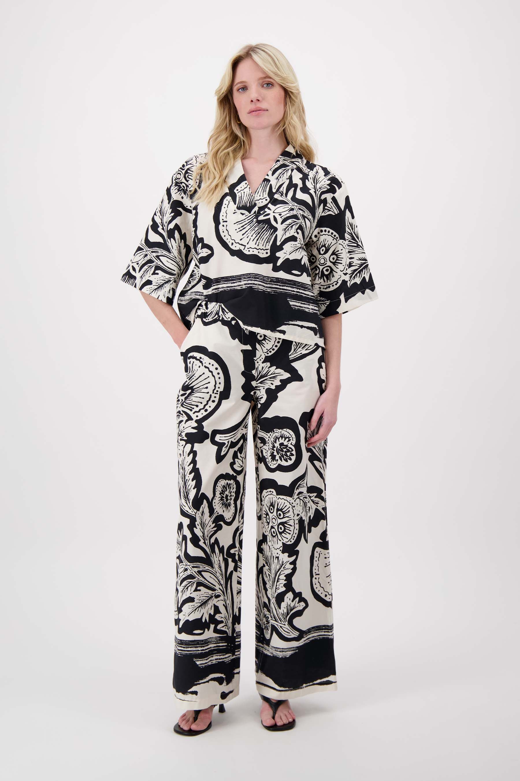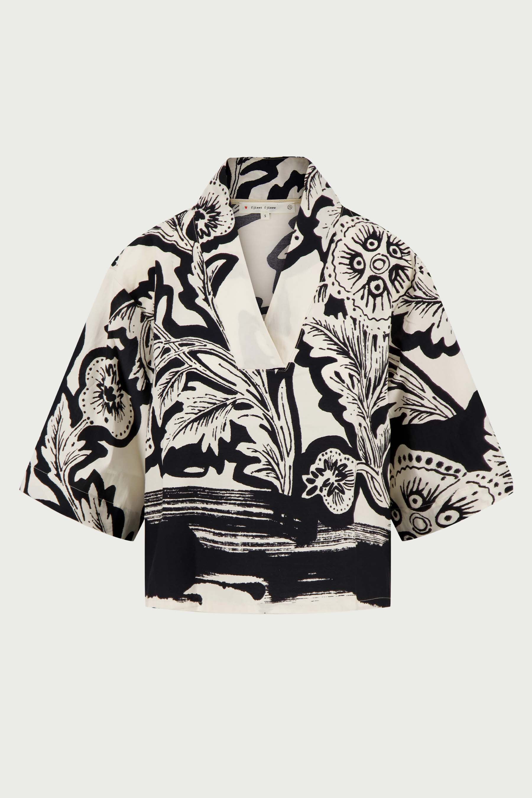 DetailsDeze blouse met V-hals en borderprint van Zusss is een frisse toevoeging aan je garderobe. De zwarte en soft kit kleuren vormen samen een opvallend, artistiek patroon dat elke outfit direct een speelse twist geeft. Dankzij de korte mouwen en de luchtige stof is deze blouse ideaal voor warme dagen, terwijl de ruime pasvorm zorgt voor comfort zonder in te boeten aan stijl.Materiaal: 100% katoenKleur: Zwart