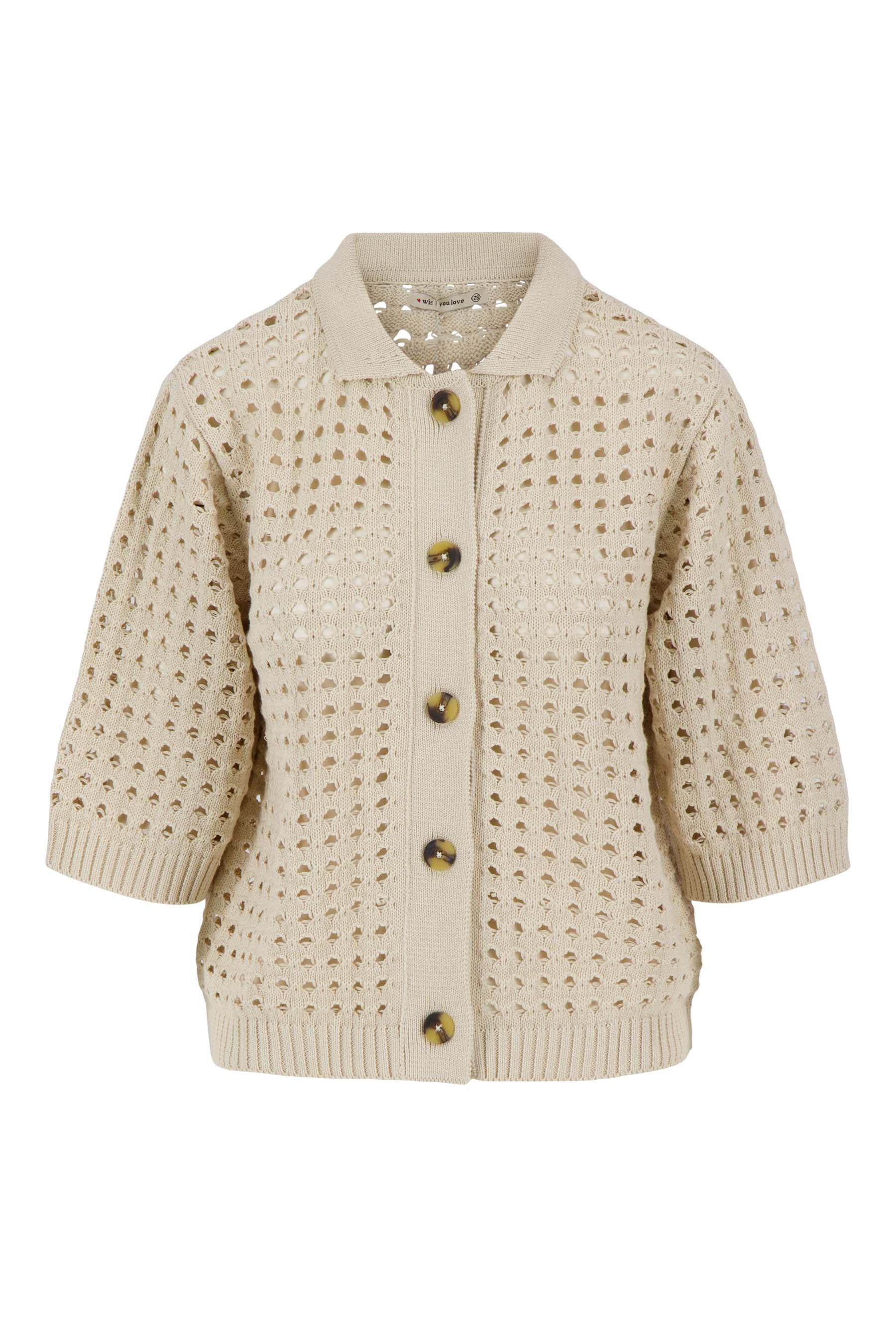 Dit Zusss vest met polokraag is een perfecte keuze voor wie houdt van een zomerse ajour look. Het vest met polokraag valt op door het opengewerkte ajour patroon en de korte mouwen, wat zorgt voor een luchtige, casual uitstraling. Gemaakt in een zachte, kitkleurige tint, biedt dit vest veelzijdigheid in je garderobe. Het subtiele polokraagje en de knoopsluiting maken dit vest met polokraag een modieuze eyecatcher
