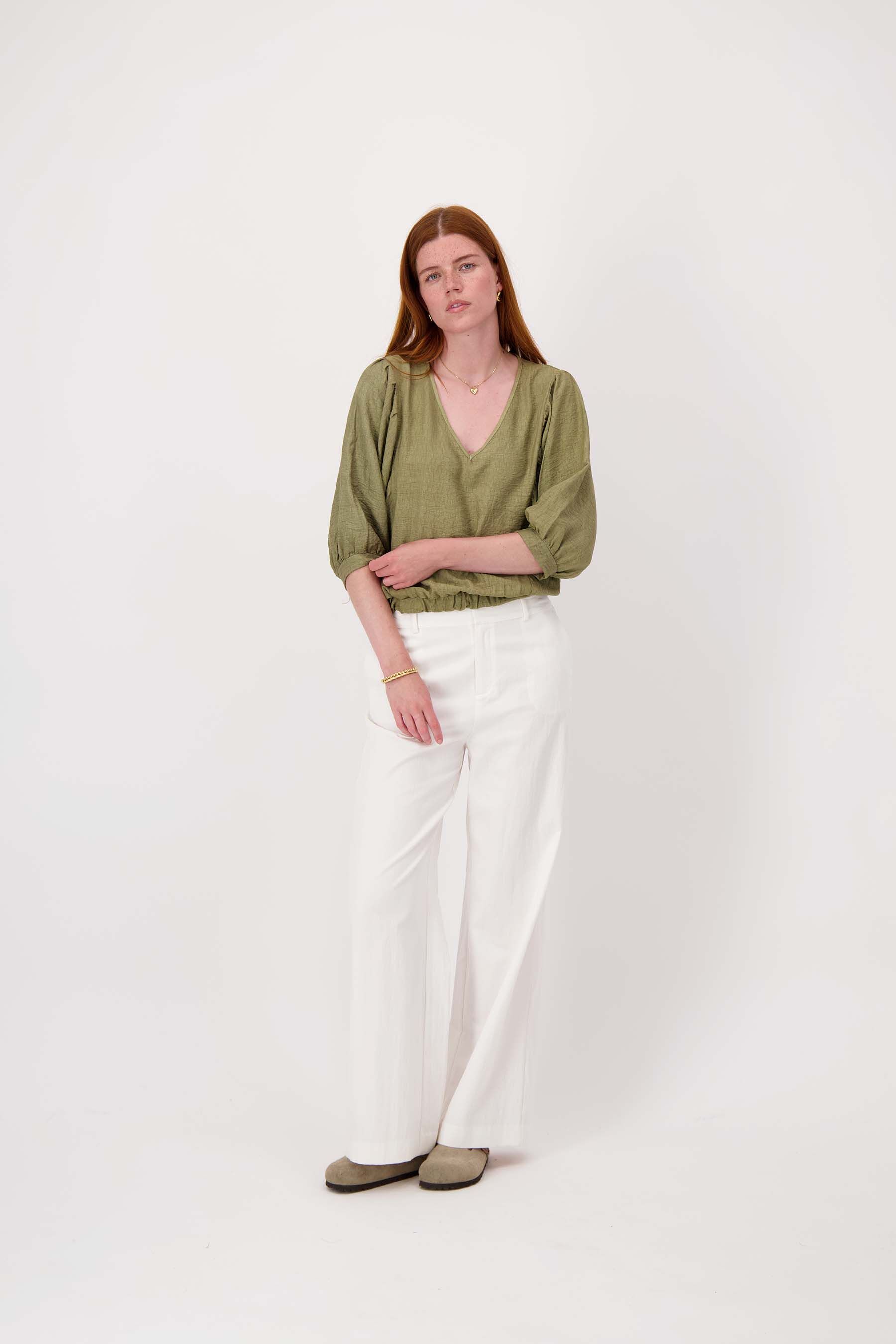 De Zusss linnenlook blouse met vleermuismouwen is een must-have voor wie houdt van luchtige en stijlvolle kleding. Deze blouse valt op door de speelse vleermuismouwen en de v-hals. De blouse heeft een mooie lichte mosgroene kleur die perfect combineert met verschillende andere voorjaarsttinten. Het linnenlook materiaal geeft een natuurlijke uitstraling, ideaal voor een casual maar verzorgde look. Materiaal: 85% viscose 15% polyamideKleur: groenArtikelnummer: 0309-0025Model draagt maat S en is 180cm lang